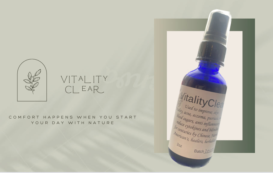 2oz bottle with spray atomizer. Vitality Clear is a combination of herbs that natives across the globe have used for skin issues including acne, psoriasis and eczema.